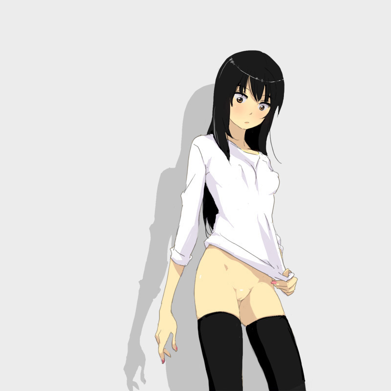 black hairblushbottomlessbrown eyeserect nipplesFlag for Deletionlong hairlooking downnail polishno brano pantiespussyshaved pussythighhighs
