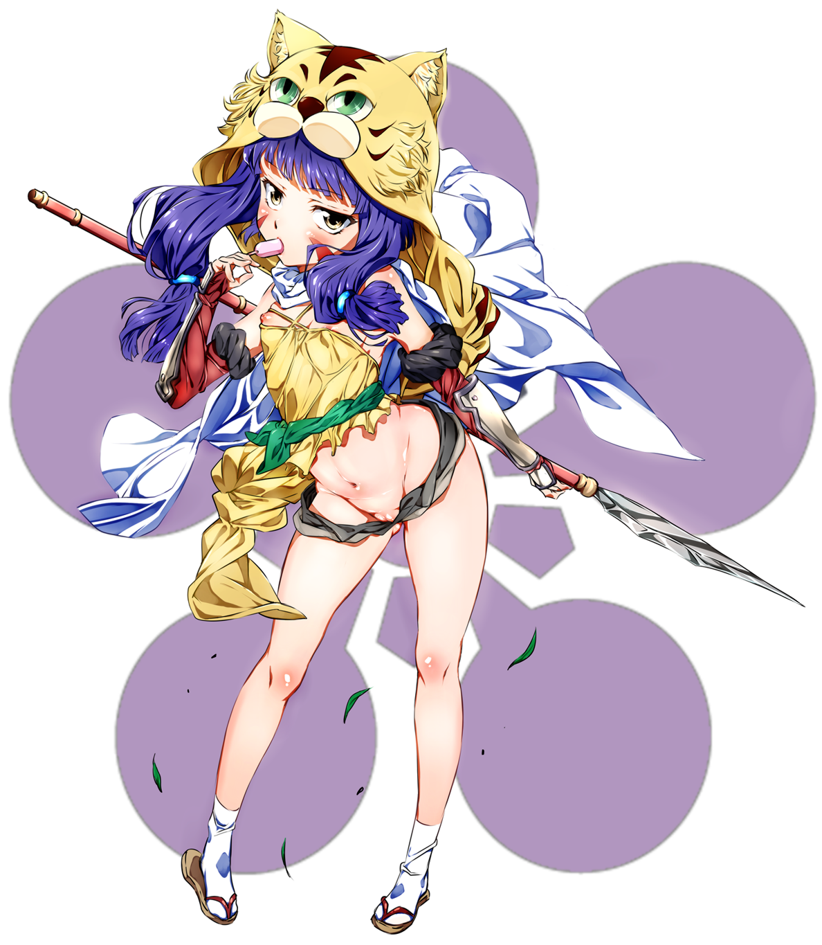 facial markFlag for Deletionflat chestgauntletslong hairmouth holdnipple slipnipplespolearmpopsiclepurple hairpussysandalsshortssolospeartiger hoodunbuttonedweapon