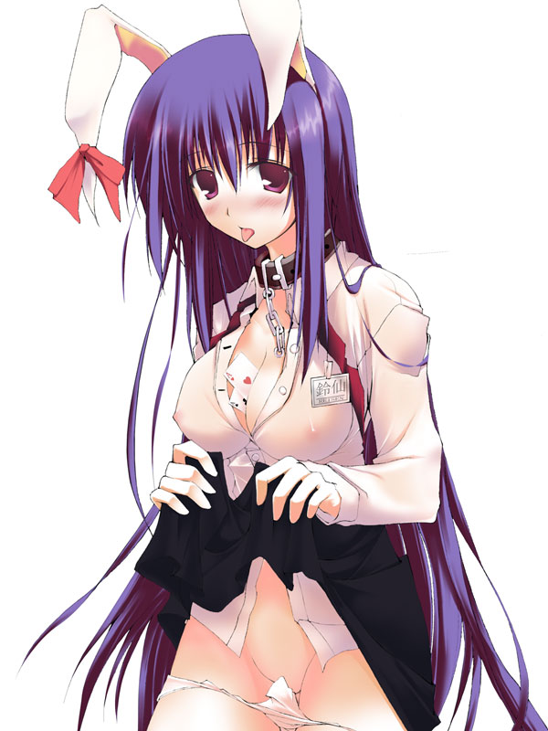 between breastsblushbreastsbunny earcardcard between breastscardscleavagecollarFlag for Deletionlarge breastslong hairobject between breastspantiespanty pullpurple eyesspurple hairsee throughskirtskirt lifttongueunderwearvery long hair
