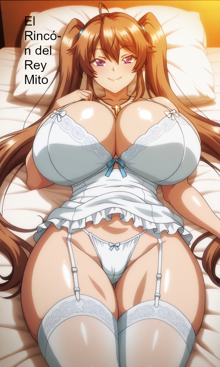 babydollbedroomblushbreastscleavagecross necklacefemaleFlag for Deletiongarter beltindoorslace trimlarge breastslingerielong hairlooking at viewerlyingon backon bedorange hairpillowred eyesrinconmitosmilesolotwintailswhite lingeriewhite pantieswhite thighhighs