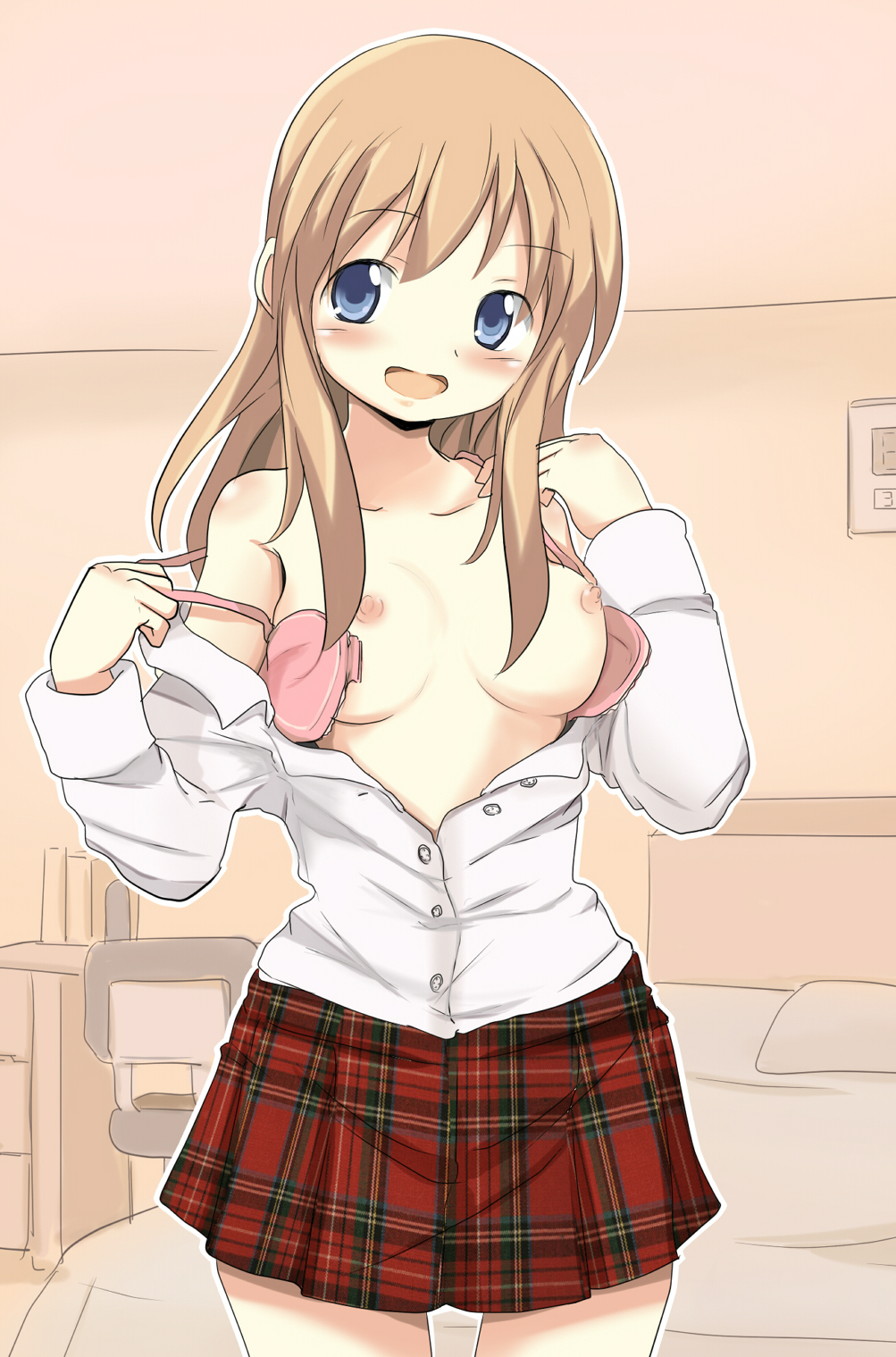 bedbed sheetblonde hairblue eyesblushbrabreastscollarbonedress shirtFlag for Deletionlong hairlong sleevesmedium breastsnipplesoff shoulderopen braopen clothesopen mouthopen shirtpink braplaidplaid skirtschool uniformshirtskirtsolounbuttonedunderwearundressingwing collar