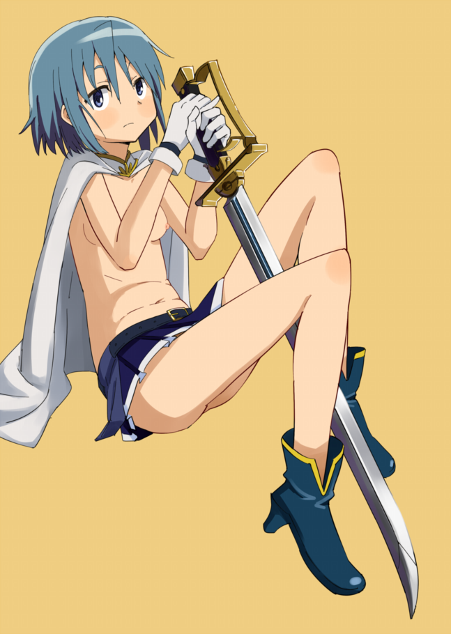bare armsbare legsbeltblue eyesblue haircapefemaleFlag for Deletionglovesmagical girlmidriffnavelnipplesno brano legwearno shirtshoesshort hairskirtsoloswordtoplessweapon