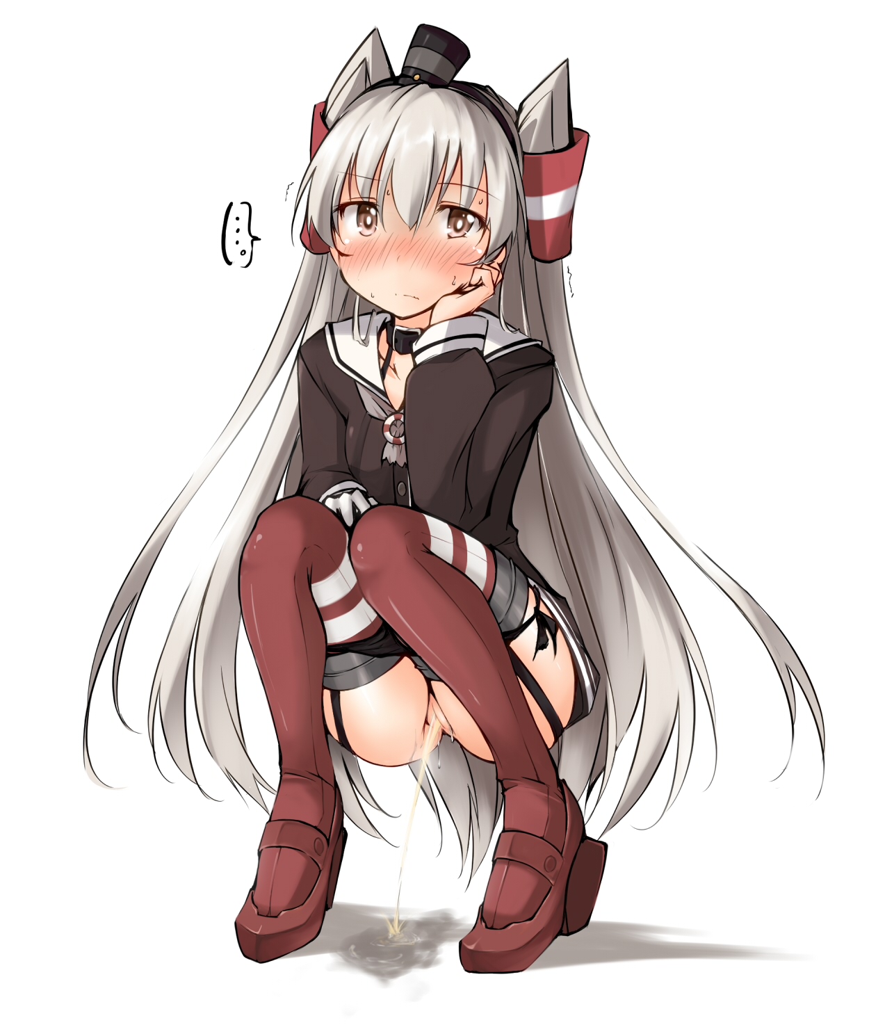 black pantiesblushbrown eyesfemaleFlag for Deletiongarter strapshair ornamenthair tubeshand on own cheeklong hairlong sleeveslooking at viewerneckerchiefpantiespanty pullpeeingred legwearschool uniformserafukusilver hairsolosquattingsweatthighhighstwo side upunderwearvery long hair