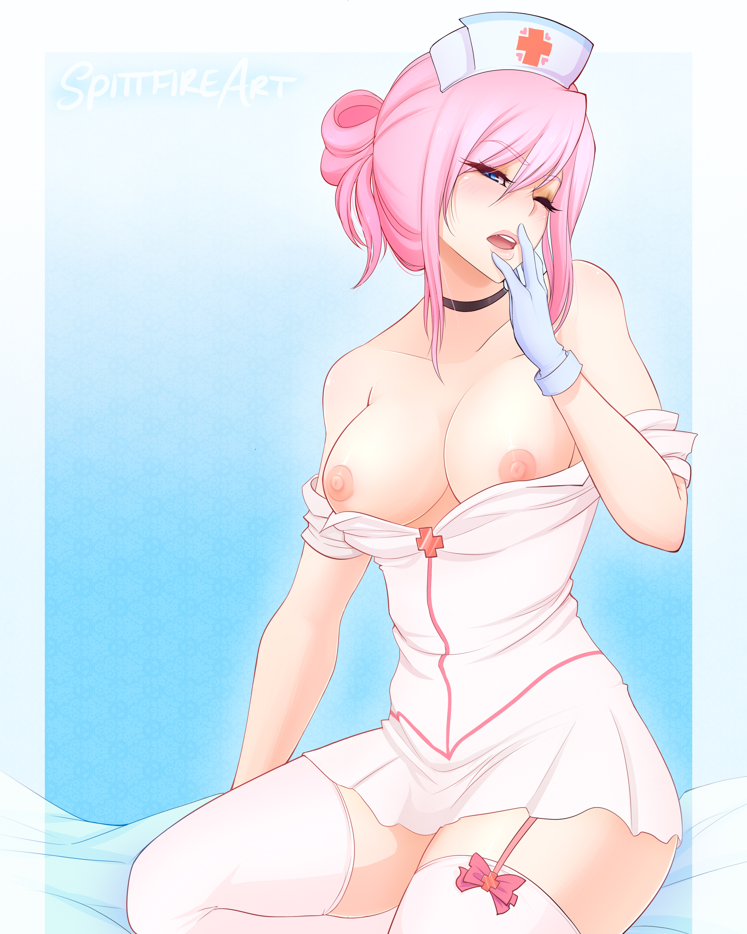 areolaebare shouldersblue eyesblushbreastsclothesfemaleFlag for Deletiongloveshumanmedium breastsnipplesnursepink hairribbonsolo