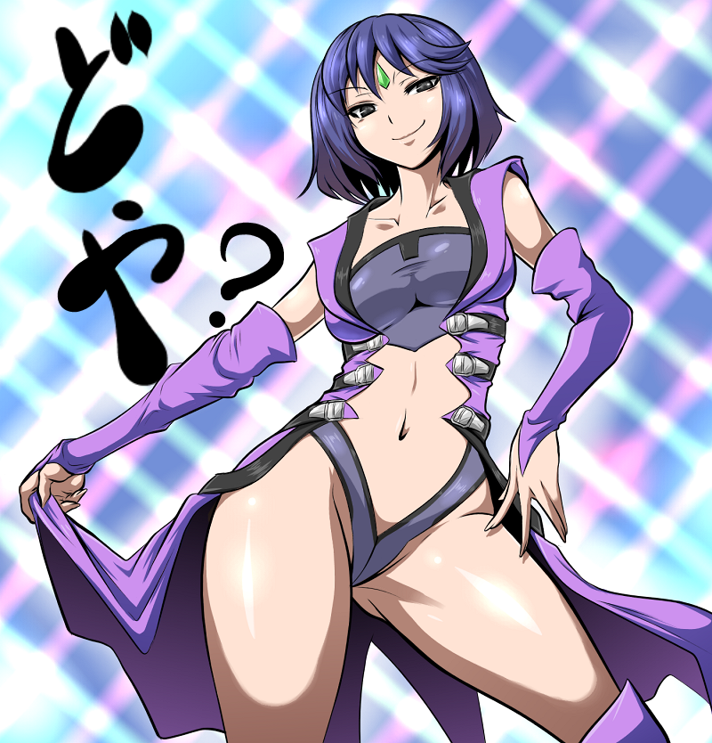 blue hairbreastscollarbonedetached sleevesFlag for Deletionforehead jewelhairlarge breastsmidriffnavelshort hairsmirkthick thighsthighs