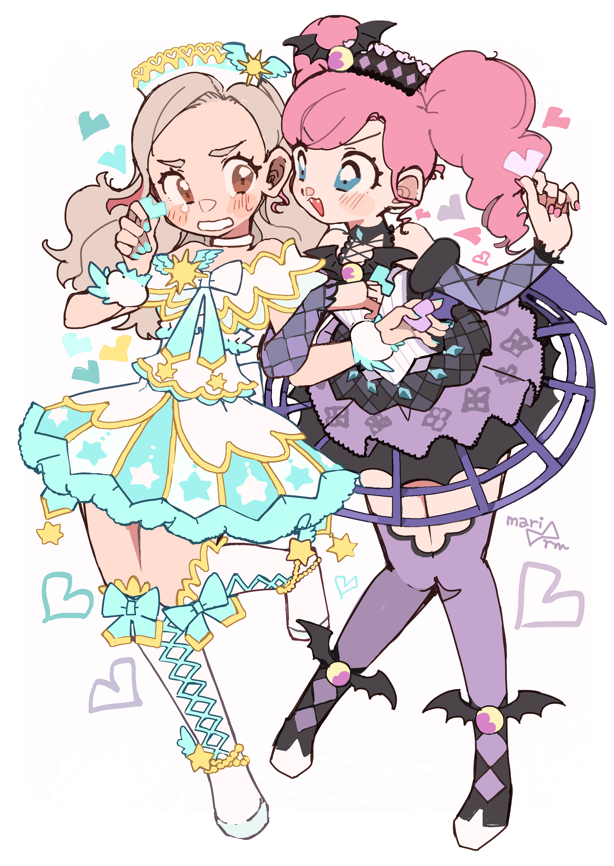 :d2girlsaikatsu! x pripara the movie -deai no kiseki!-black bootsblue eyesblue nailsbootscosplaydetached sleevesdressfull bodyheartidol clothesknee bootskurosu aroma (cosplay)long hairmultiple girlsnail polishopen mouthpink hairpink nailspurple dresspurple thighhighsshiratama mikan (cosplay)smilestandingstanding on one legstar (symbol)star printsun symbolthighhighstwintailswhite bootswhite dresswrist cuffs