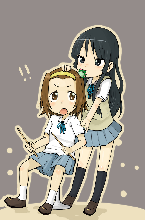 00s2girlsblack eyesblack hairblunt bangsbrown eyesbrown hairdrumstickseatinghairbandhime cutlong hairmultiple girlsmushroomschool uniformshort hairsitting