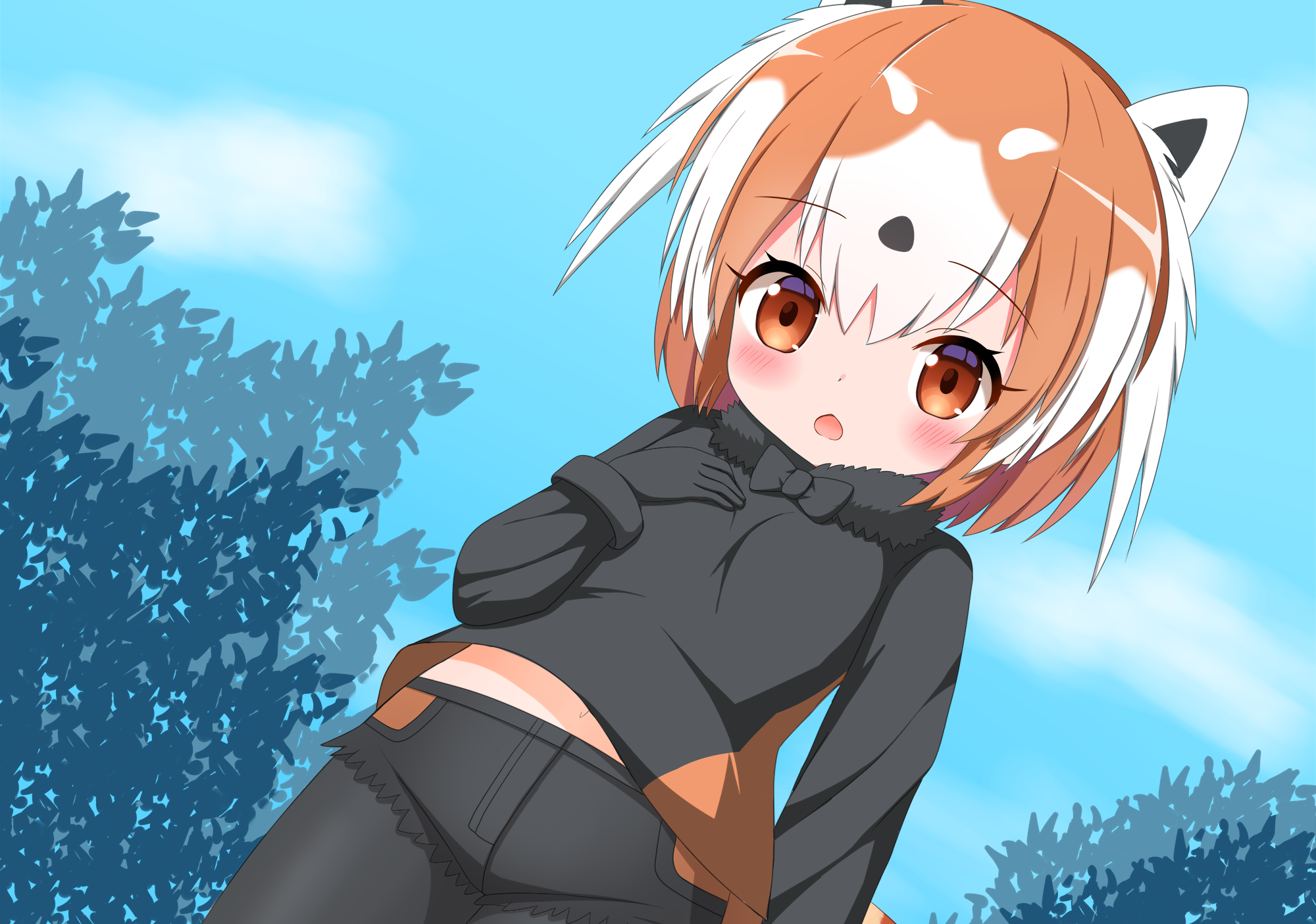 1girlblack bowblack bowtieblack glovesblack hairblack pantyhoseblack shirtblack shortsblue skyblushbowbowtiebreastsbrown eyesbrown hairchestnut mouthclouddaydutch anglefur collargloveshair between eyeshand uplooking at viewermulticolored hairopen mouthoutdoorspantyhosepantyhose under shortsred panda earsred panda girlred panda tailshirtshort shortsshortsskysmall breastssolotwo-tone hairwhite hair