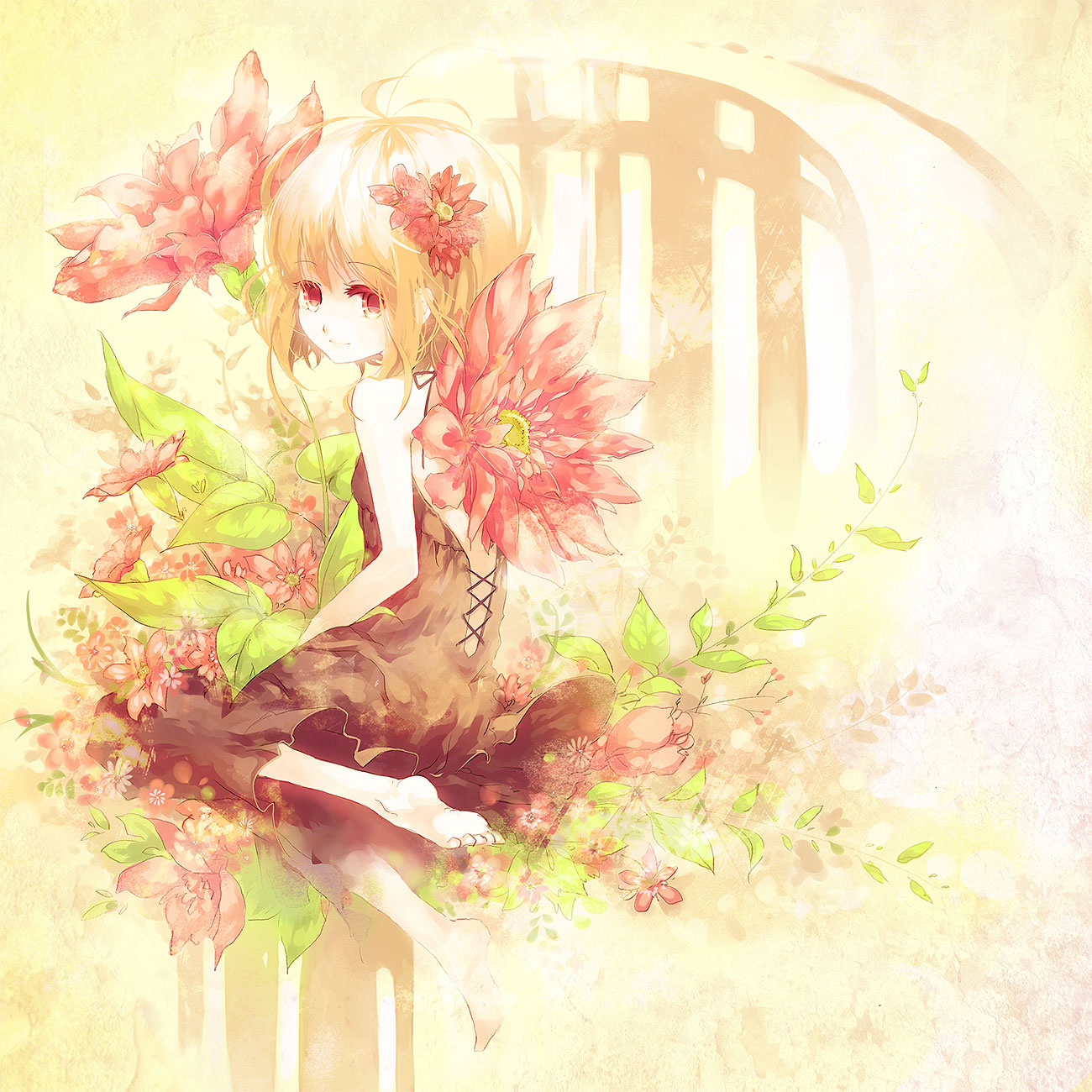 1girlbarefootblonde hairchilddressfeetfemale focusflat chestflowerhair flowerhair ornamentleaflooking backoutdoorsplantred eyesshort hairsittingsolo
