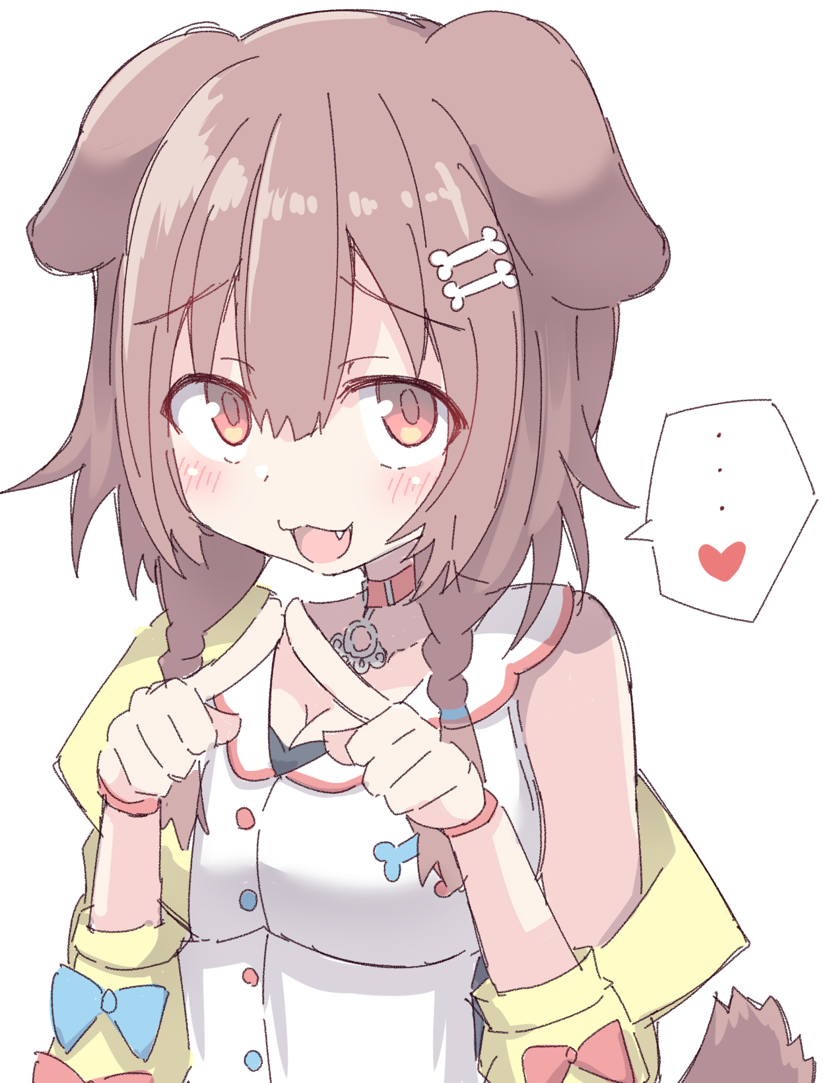 1girlanimal earsbone hair ornamentbraidbrown hairdog earsdog girldog tailhair ornamentjacketsolotailtwin braidswhite backgroundyellow jacket