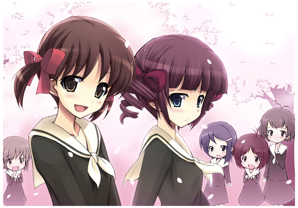 00s6+girlsblue eyesbrown eyesbrown haircherry blossomsdrill hairmultiple girlspetalsschool uniformserafukushort twintailstwintails