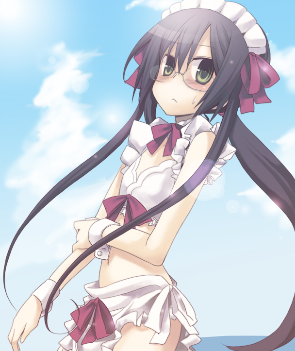 1girlblack hairclouddayfemale focusflat chestglasseslong hairmaidmaid headdressoutdoorsskysolowrist cuffs