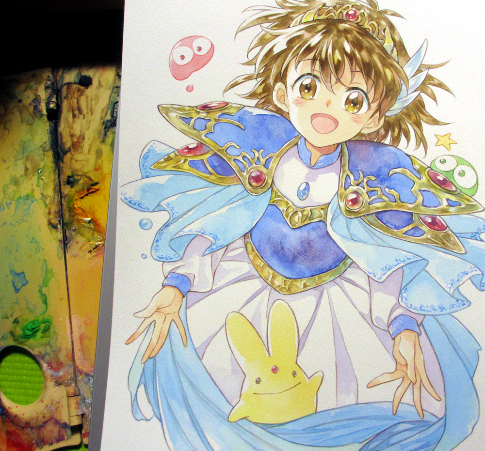 1girlarmorblack eyesblue shawlbreastplatebroochbrown eyesbrown hairclosed mouthcropped legsdressgold tiaragold trimgreen eyeshair ornamentjewelrylooking at viewermedium hairopen mouthpauldronsred eyesshawlshoulder armorslime (creature)smilestar (symbol)white dresswing hair ornament
