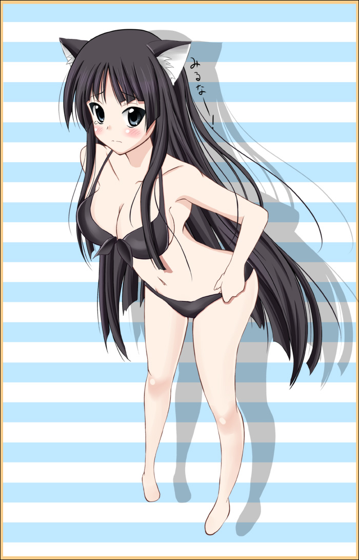 00s1girlanimal earsbad anatomybad feetbarefootbikiniblack bikiniblack eyesblack hairblushcat earsfeetfemale focusfront-tie toplong hairnavelpoorly drawnsolostriped backgroundswimsuit