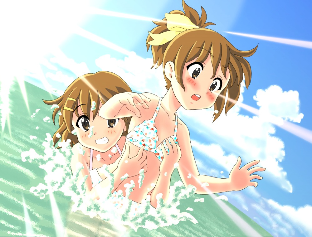 00s2girlsbikinibrown eyesbrown hairclouddaydutch angleflat chestgrabbing another's breastgropinglens flaremultiple girlsponytailshort hairsiblingssisterssplashingsurprised armsswimsuitwater