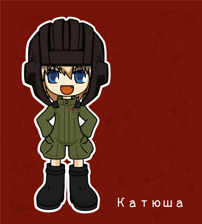 1girlblack bootsblonde hairblue eyesbootscharacter namefanghands on own hipshatlong sleeveslooking at viewermilitarymilitary uniformopen mouthoutlinered backgroundschool uniformshort hairsmilesolostandingstraight-onv-shaped eyebrowswhite outline