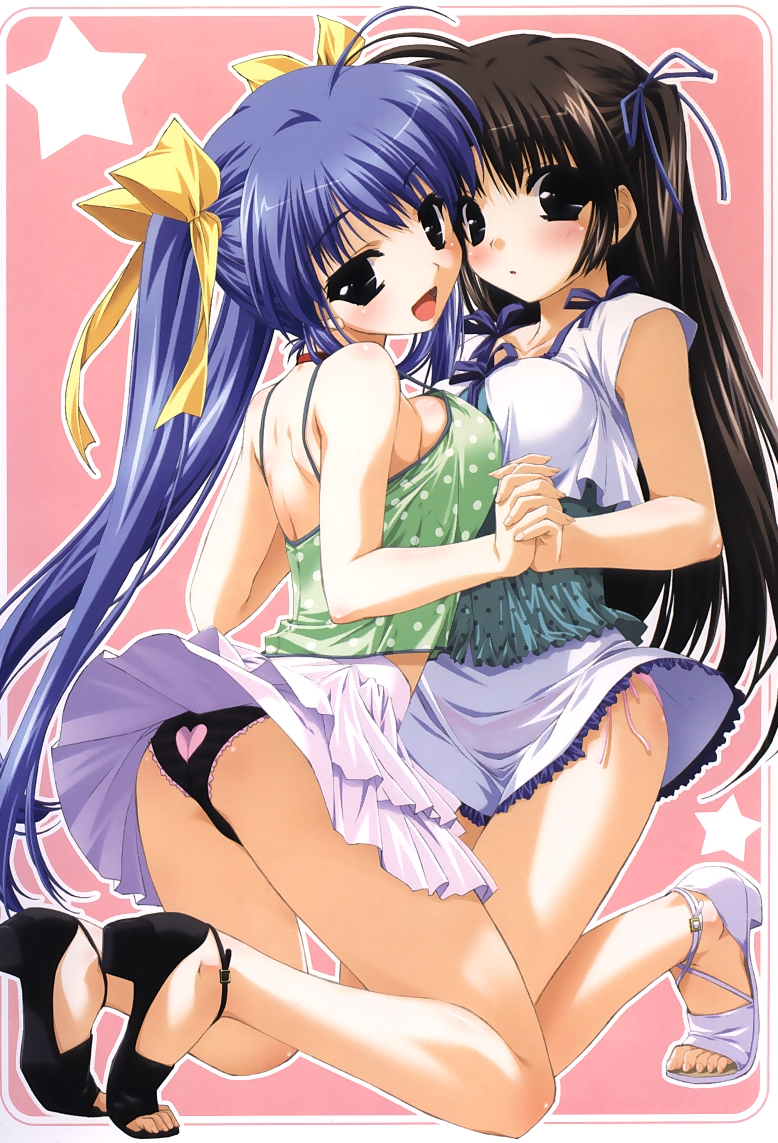 2girlsblack hairblue hairblushbreast pressbreastsfull bodyhair ribbonheartheart pantiesheart printholding handslarge breastsmultiple girlsno sockspantiespantyshotpolka dotprint pantiesribbonrounded cornersshoesside-tie pantiessymmetrical dockingtwintailsunderwearupskirtwindwind lift
