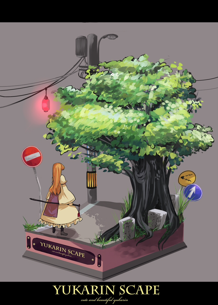 1girlblonde hairenglish textfaux figurinefemale focusgrey backgroundlanternletterboxedno headwearribbonroad signscenerysignsimple backgroundsolotabardtree
