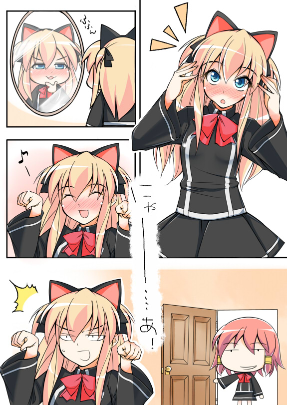 1boy2girlsanimal earsblonde hairblue eyesblushcat earslong hairmirrormultiple girlspaw posepink hairwalk-in