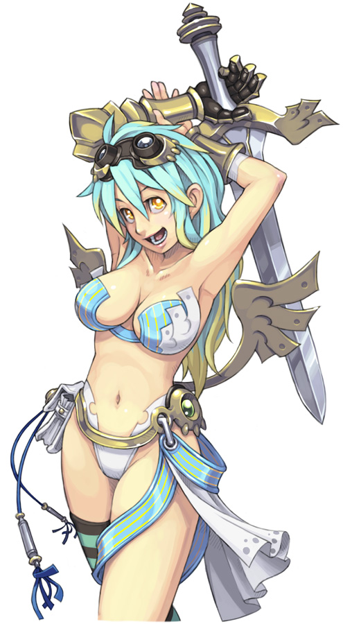 1girlaqua hairarmorarmpitsarms upbikini armorblonde hairbreastscleavagefantasyfemale focusgauntletsgoggleslarge breastslong hairmulticolored hairnavelsimple backgroundsoloswordweaponwingsyellow eyes
