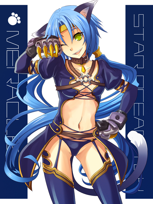 1girlanimal earsarmorblue hairbreastscat earscat tailcharacter nameclawscleavagecleavage cutoutclothing cutoutcollarcopyright namedetached sleevesfemale focusgauntletsgreen eyesheadbandlong hairmedium breastsmidriffnavelo-ringone eye closedpantiessmilesolotailthighhighsthongunderwearvery long hairwink