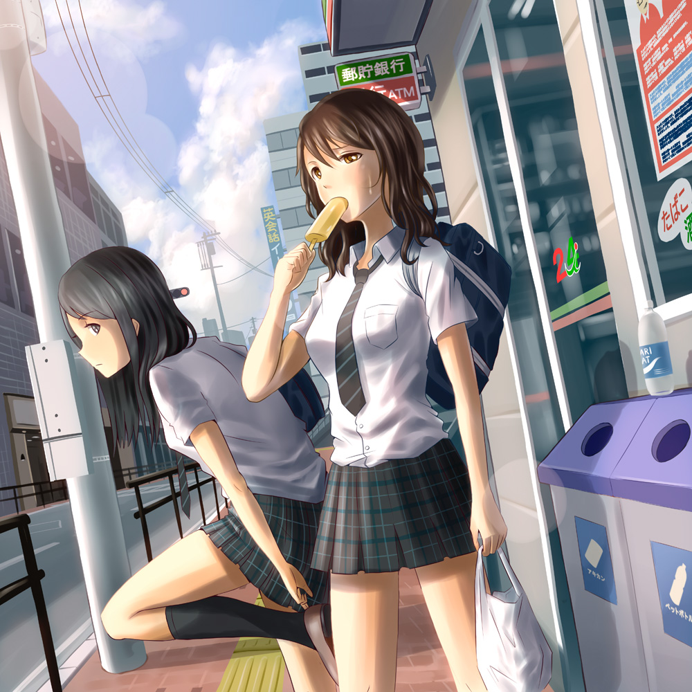 2girlsblack hairbottlebrown eyesbrown haircityfoodgrey eyesmultiple girlsplaid clothesplaid skirtpopsicleschool uniformskirtslice of lifesockswater bottle