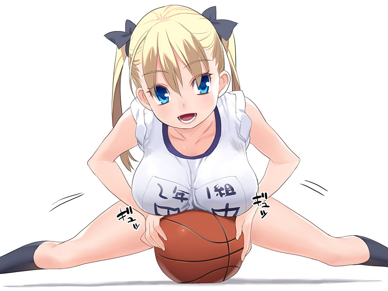 1girlballbasketballbasketball (object)blonde hairblue eyesbreast pressbreastsfemale focusgym uniformlarge breastssimple backgroundsleeves rolled upsolosplitspread legstwintailswhite background
