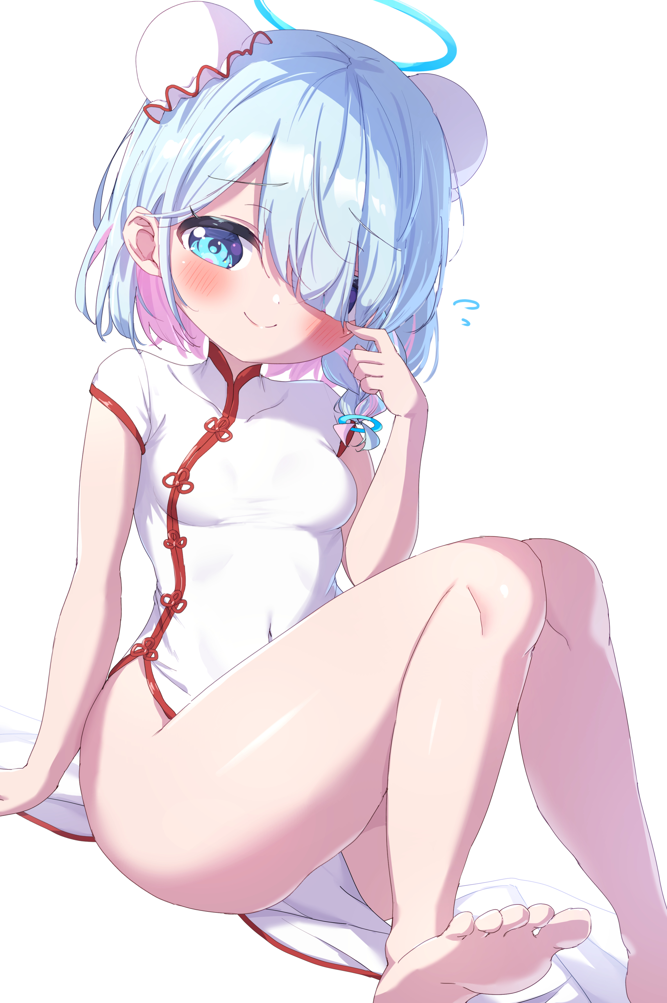 1girlbarefootblue eyesblue hairblushbraidbreastsbun coverchina dresschinese clothesclosed mouthcovered naveldouble bundressflying sweatdropshair bunhair over one eyehalohand upknees together feet apartmulticolored hairpelvic curtainpink hairshort sleevessimple backgroundsittingsmall breastssmilesolessolostreaked hairthighstwo-tone hairwhite backgroundwhite dress