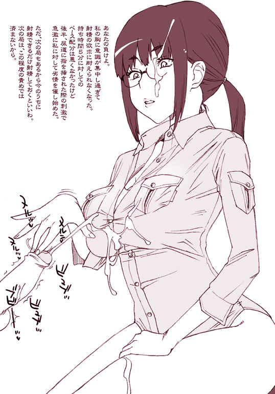 1girlbottomlessbreastscleavagecumcum on bodycum on clothescum on eyewearejaculationfacialforeskinglasseshandjobheterohuge breastsmonochromeno pantiespenissolo focusuncensored