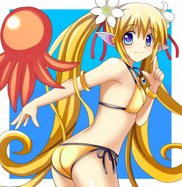 assbikiniblonde hairbraceletflat chestjewelrylong hairlooking backoctopuspointy earspurple eyesside-tie bikini bottomsoloswimsuittwintailsyellow bikini