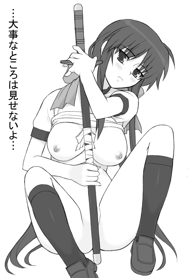 1girlbottomlessbreastscensoredclothes liftconvenient censoringfemale focusgreyscalelarge breastslong hairmonochromenipplesribbonshirt liftsockssoloswordweapon