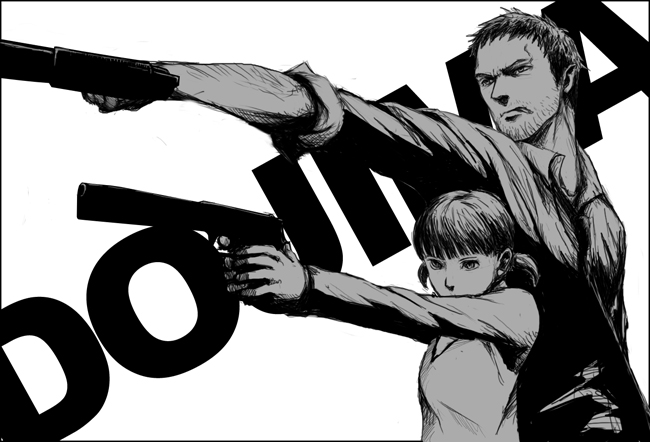 1boy1girlage differencebeard stubbleblunt bangscollared shirtcovered mouthfacial hairfamily bondingfather and daughterfinger on triggergreyscalegunmanlymonochromemustache stubbleparodypoliceshirtshort twintailssimple backgroundsleeves rolled upstubblesuppressortwintailsweaponwhite background