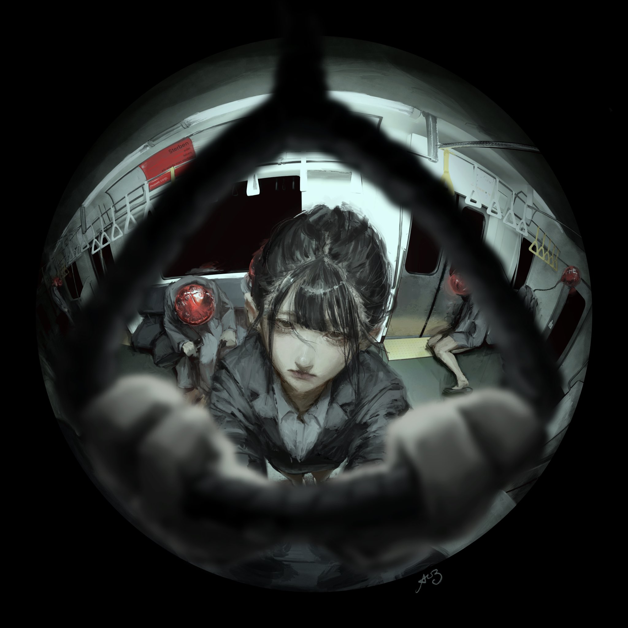 2girls3boysbags under eyesblack hairblurryblurry foregroundfanged bangsfisheyeformal clothesfrom abovehand griphorror (theme)lapelslipslooking at viewermultiple boysmultiple girlsnoosenotched lapelspale skinsolo focusstandingsuittrain interior