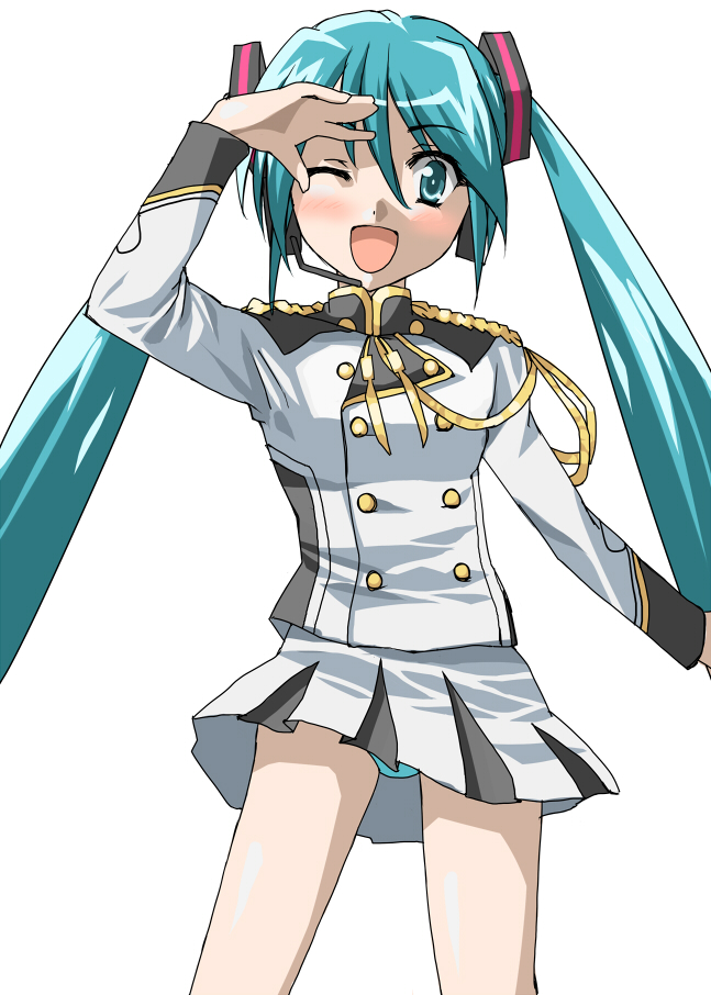 00s1girlblushfemale focusgreen eyesgreen hairheadsetmajorettematching hair/eyesmicrophoneone eye closedpantiespantyshotsalutesolotwintailsunderwearwink