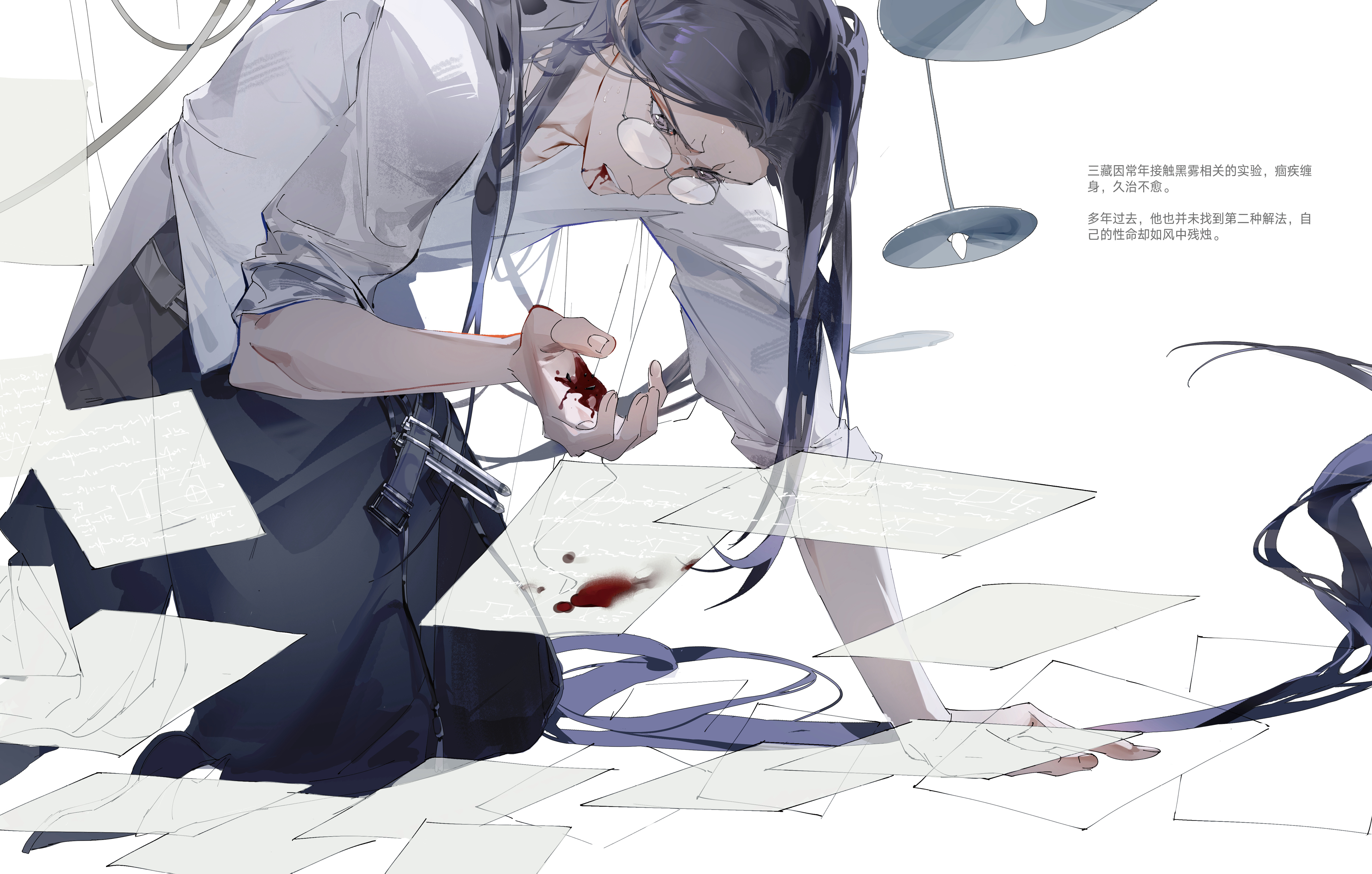 1boyall foursapronarm supportblack apronblack hairblack pantsbloodblood from mouthblood on handsblood on papercablechinese textfeet out of framefurrowed browglassesgrey eyesgrimacehair behind earhanging lightkneelinglong hairlooking at handon floorpantspaperparted bangsparted lipsround eyewearshirtsleeves rolled upsolosweattest tubetest tube rackvery long hairwaist apronwhite backgroundwhite shirt