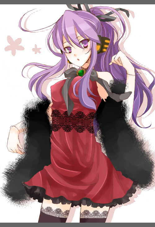 1girldressfemale focusgenderswapheadphoneslong hairponytailpurple eyespurple hairred dressred skirtshort dressskirtsolothighhighszettai ryouiki