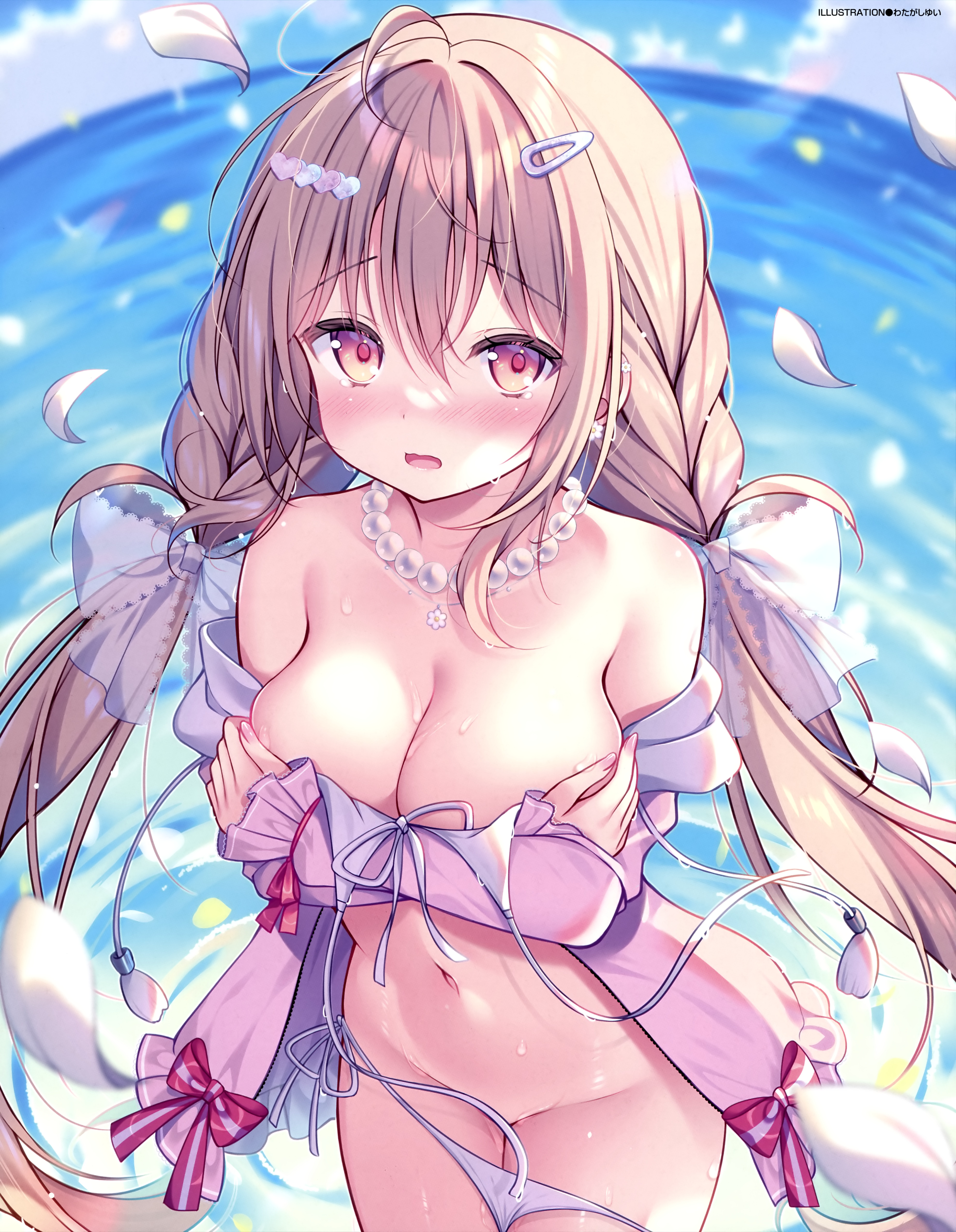 1girlahogebare shouldersbead necklacebeadsbikiniblue skyblushbowbraidbreastsbrown eyesbrown haircleavagecloudcollarboneconvenient censoringdayfalling petalshair between eyeshair bowhair ornamenthairclipjacketjewelrylarge breastslong hairlong sleeveslooking at viewernavelnecklaceoceanoff shoulderopen clothesopen mouthoutdoorspetalspink jacketribbonsidelocksskysoloswimsuittwintailsvery long hairwardrobe malfunctionwaterwhite bikiniwhite petals