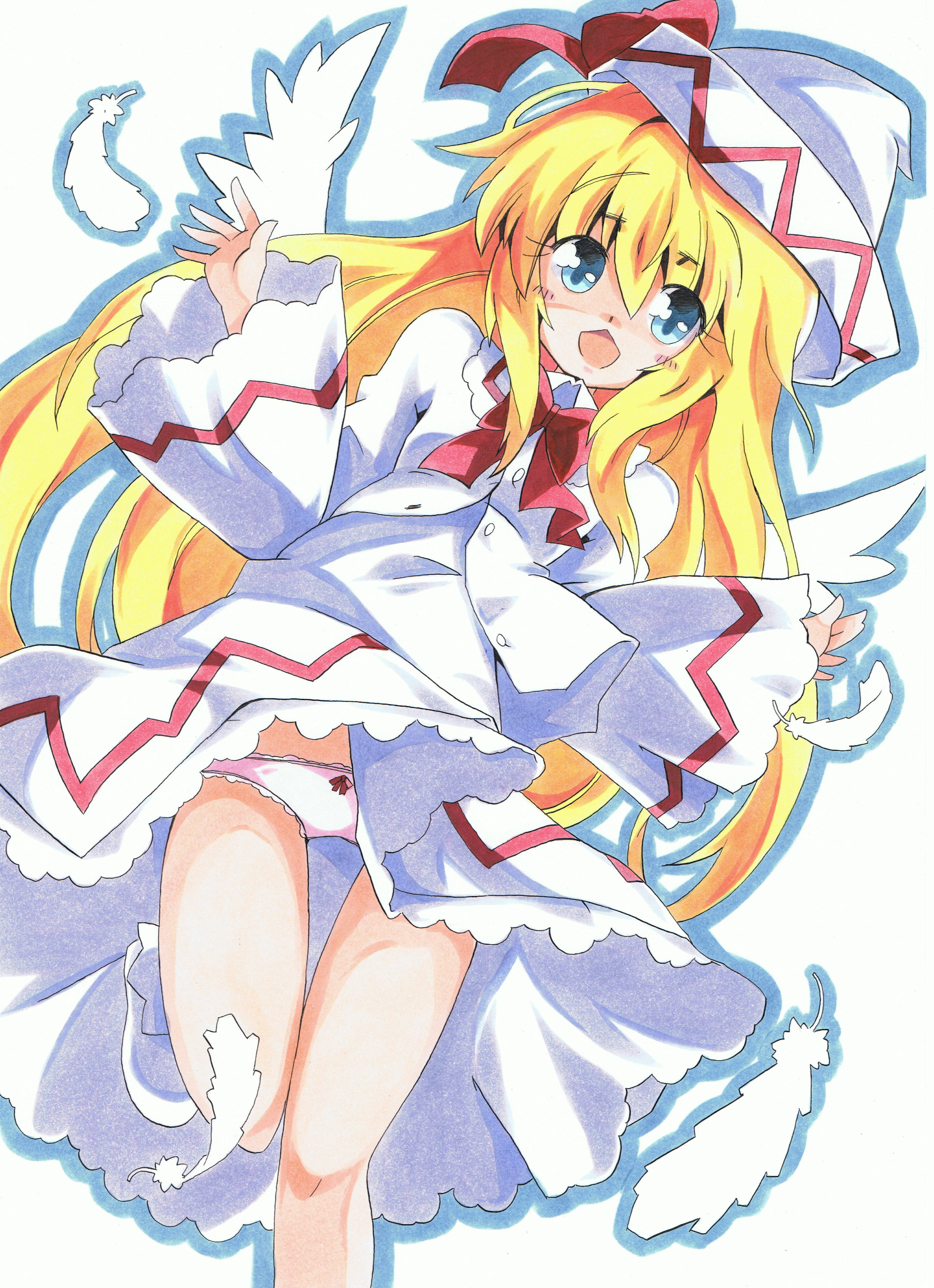 1girlangel wingsblonde hairblue eyesdressfairyfemale focushatlong hairpantiespantyshotribbonsolounderwearwhite backgroundwhite wingswings