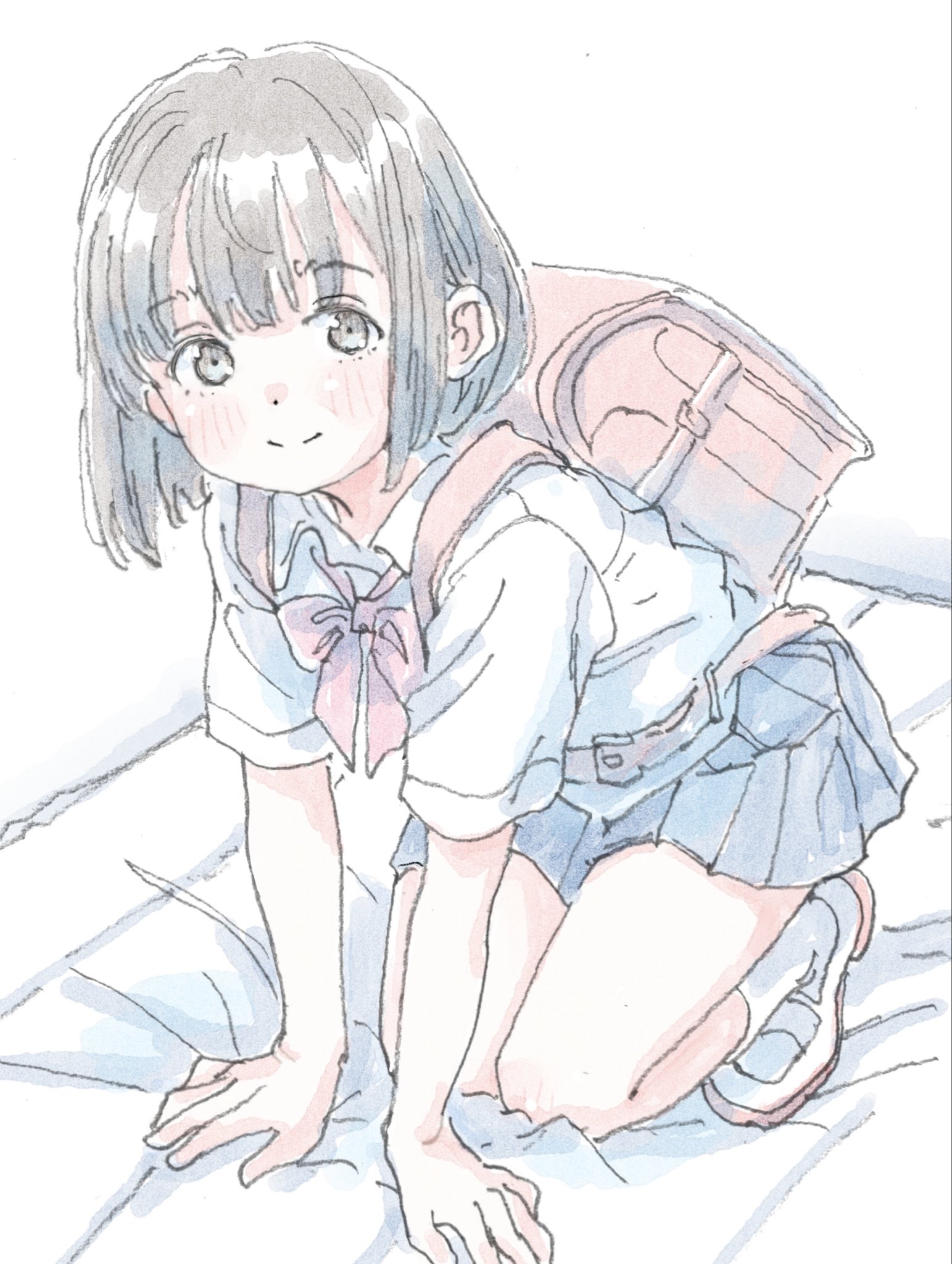 1girlankle socksarm supportbackpackbagblue skirtblunt bangsblushbowbowtiebrown eyesbrown hairclosed mouthcollared shirtdot nosedouble-parted bangsfull bodykneelinglooking at viewerpleated skirtrandoserured bagred bowred bowtieschool bagschool uniformshirtshoesshort hairsimple backgroundskirtsmilesocksuwabakiwhite backgroundwhite shirtwhite shoeswhite socks