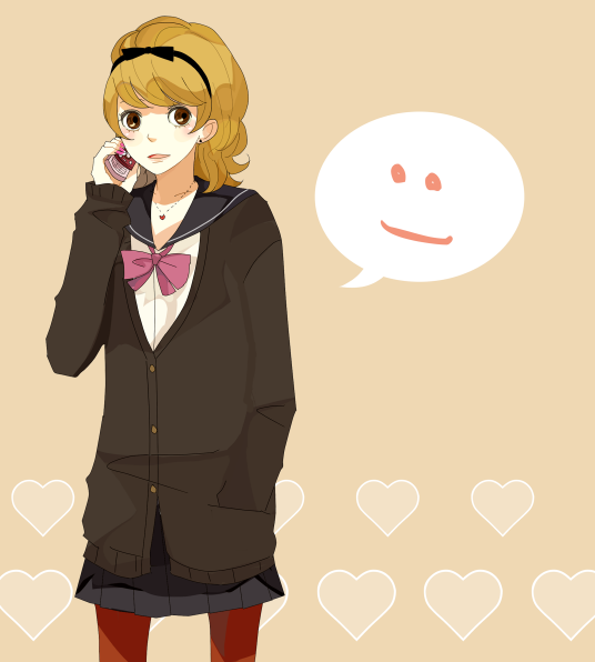 1girlblonde hairbowbrown eyescardigancellphoneearringsfemale focushairbandheartjewelrynail polishnecklacepantyhosephonepink nailspleated skirtribbonschool uniformskirtsmilesolotalking on phone