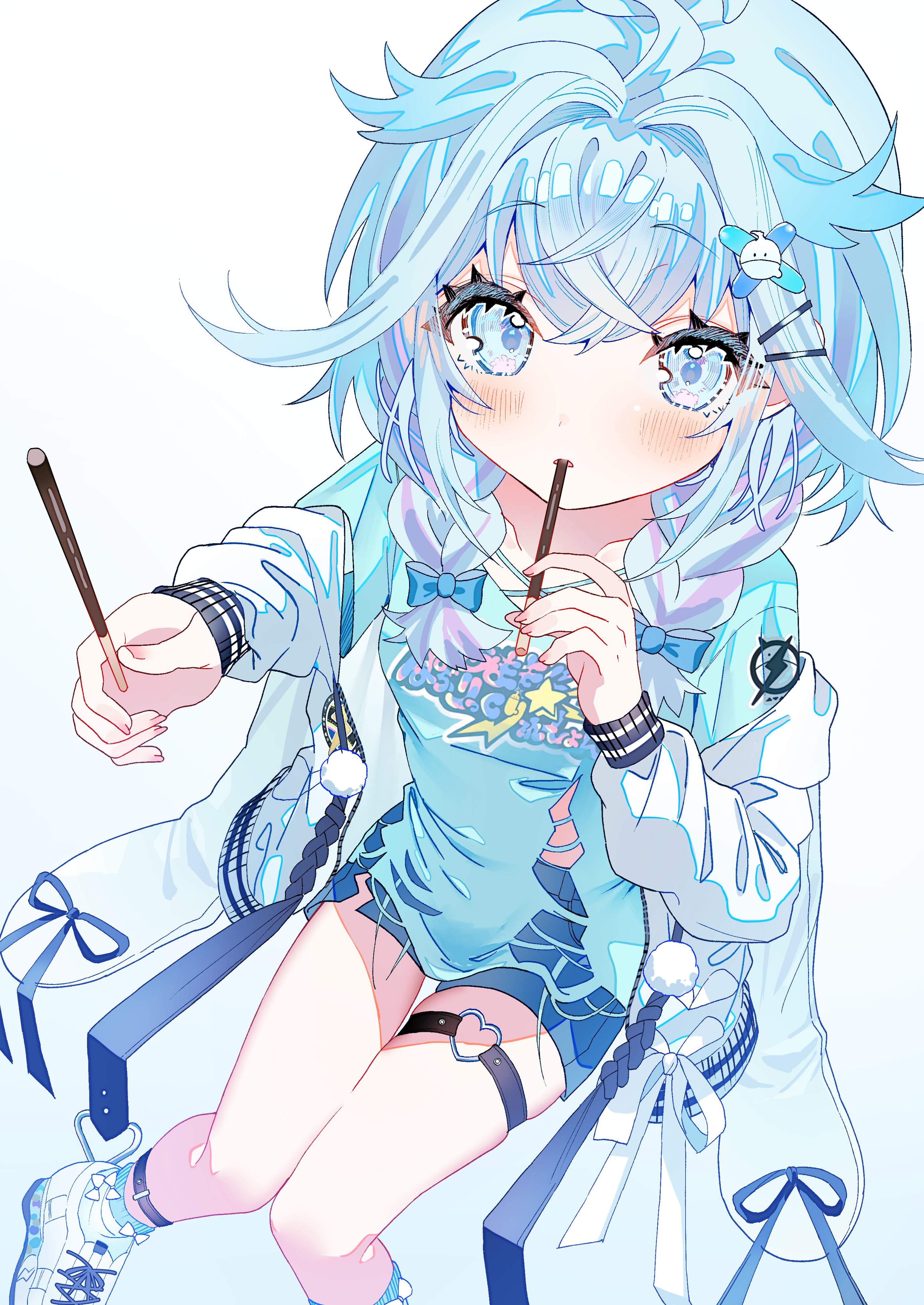1girlahogeankle strapblue bowblue eyesblue hairblue shirtblue shortsbowbraidcrossed bangsfeet out of framefoodfood in mouthfrom abovegradient backgroundhair flapshair ornamentheartheart o-ringholdingholding foodholding pockyincoming foodinvisible chairjacketlong hairlooking at viewermulticolored hairo-ringo-ring thigh strappink hairpockypocky in mouthshirtshoesshort shortsshortssimple backgroundsittingsneakerssolostreaked hairthigh straptorn clothestorn shirttwin braidsvirtual youtuberwhite backgroundwhite shoes