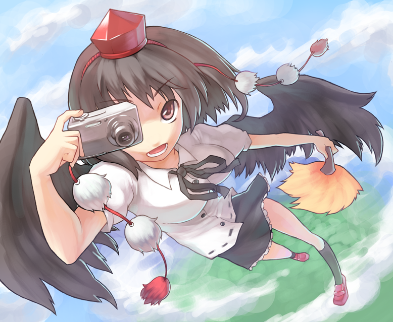 1girlblack wingsbrown haircamerafemale focusflyinghand fanhatlooking at vieweropen mouthred eyesshort hairsmilesolotokin hatwings
