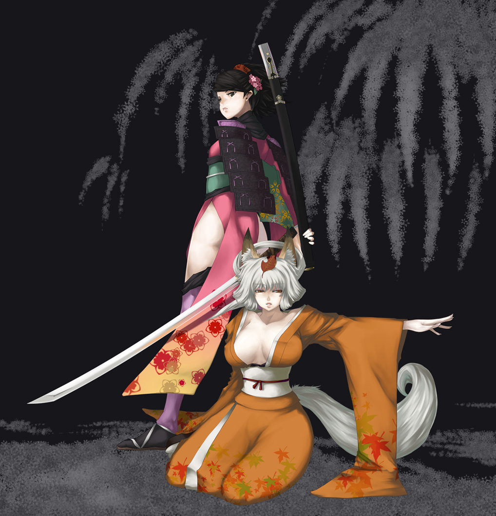2girlsanimal earsarmorblack hairbreastsbrown eyescleavageflowerfox earsfox tailhair flowerhair ornamentholdingholding swordholding weaponjapanese clotheskatanakimonolarge breastsleafleaf on headmultiple girlsorange eyesscabbardsheathswordtailweapon