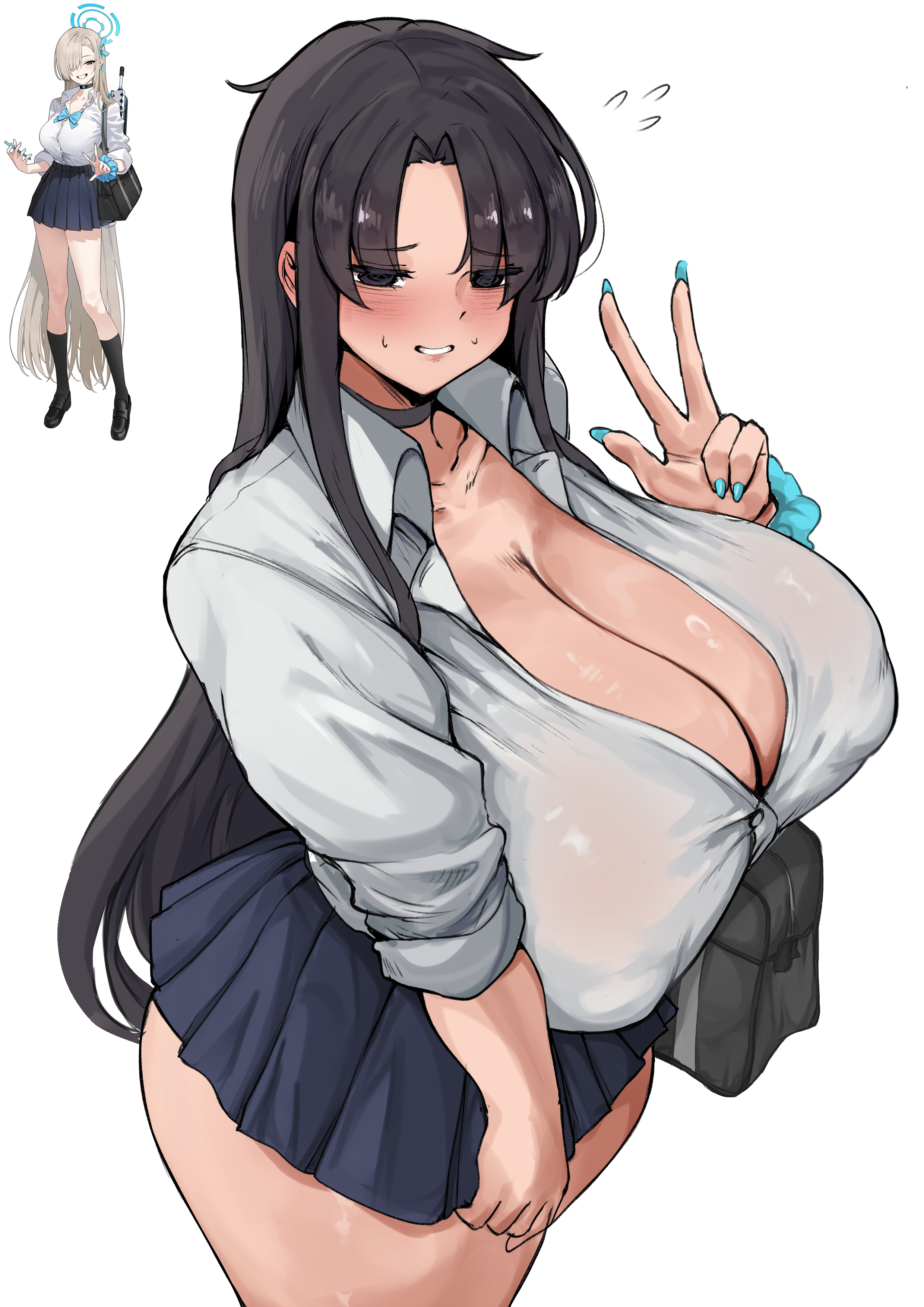 2girlsasuna (blue archive) (cosplay)bagblack chokerblack eyesblack hairblue nailsblue skirtbreastschokercleavagecollared shirtcosplayfingernailsgrinhuge breastslong fingernailslong hairlooking at viewermultiple girlsschool bagscrunchieshirtsimple backgroundskirtsmilewwhite backgroundwhite shirtwrist scrunchie