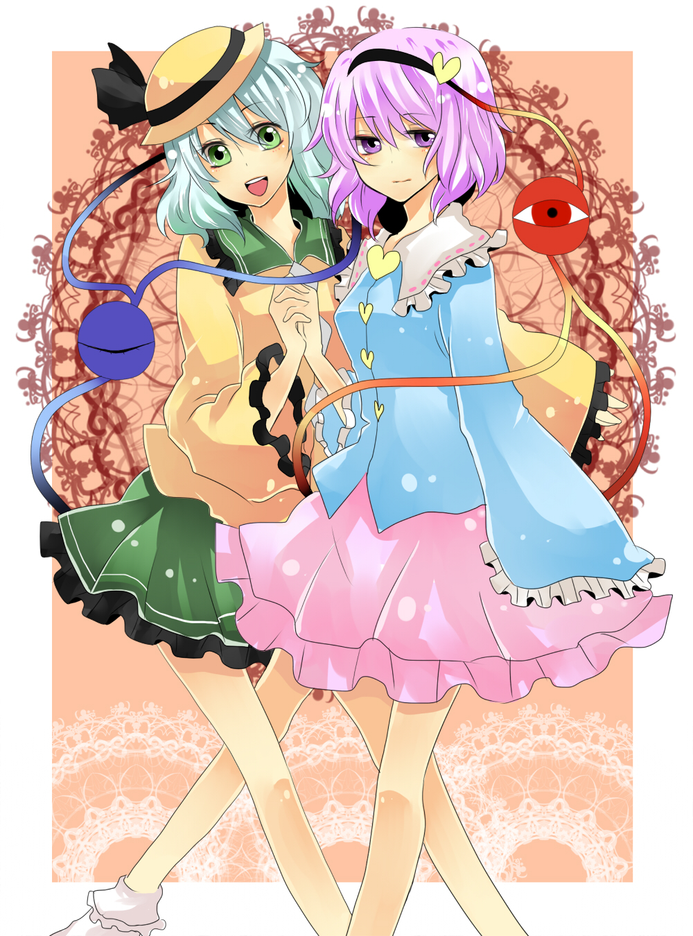 2girlsfemale focusgreen eyeshairbandhatheartholding handsmultiple girlspurple eyespurple hairshort hairsiblingssisters