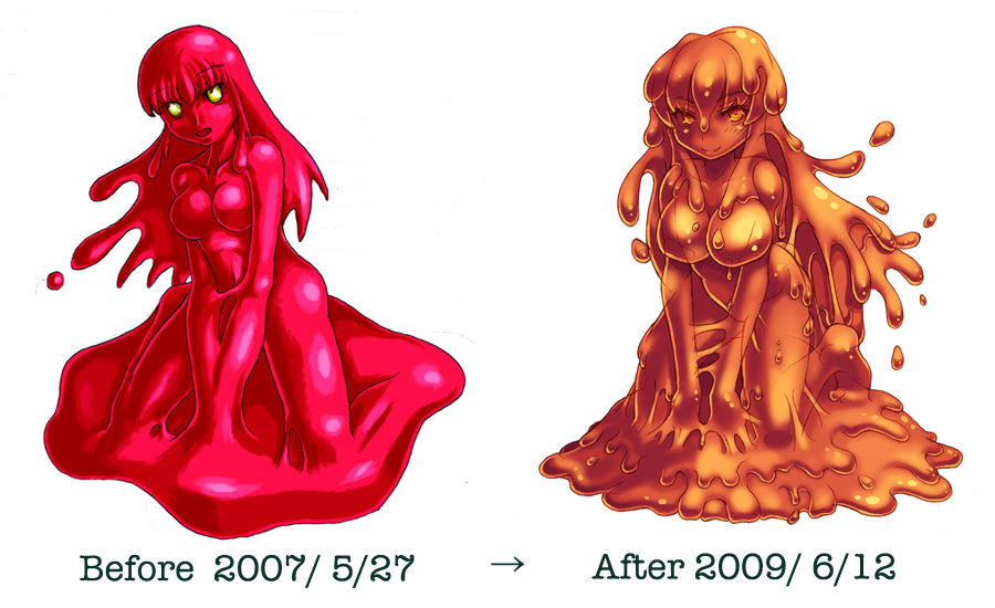 1girlbarefootbefore and afterblushbreastscomparisonfeetfoodfruitglowingglowing eyesmonster girlomitted bitsorange (fruit)red themesemiliquidsimple backgroundslime (substance)slime girlsmiletoesyellow eyes