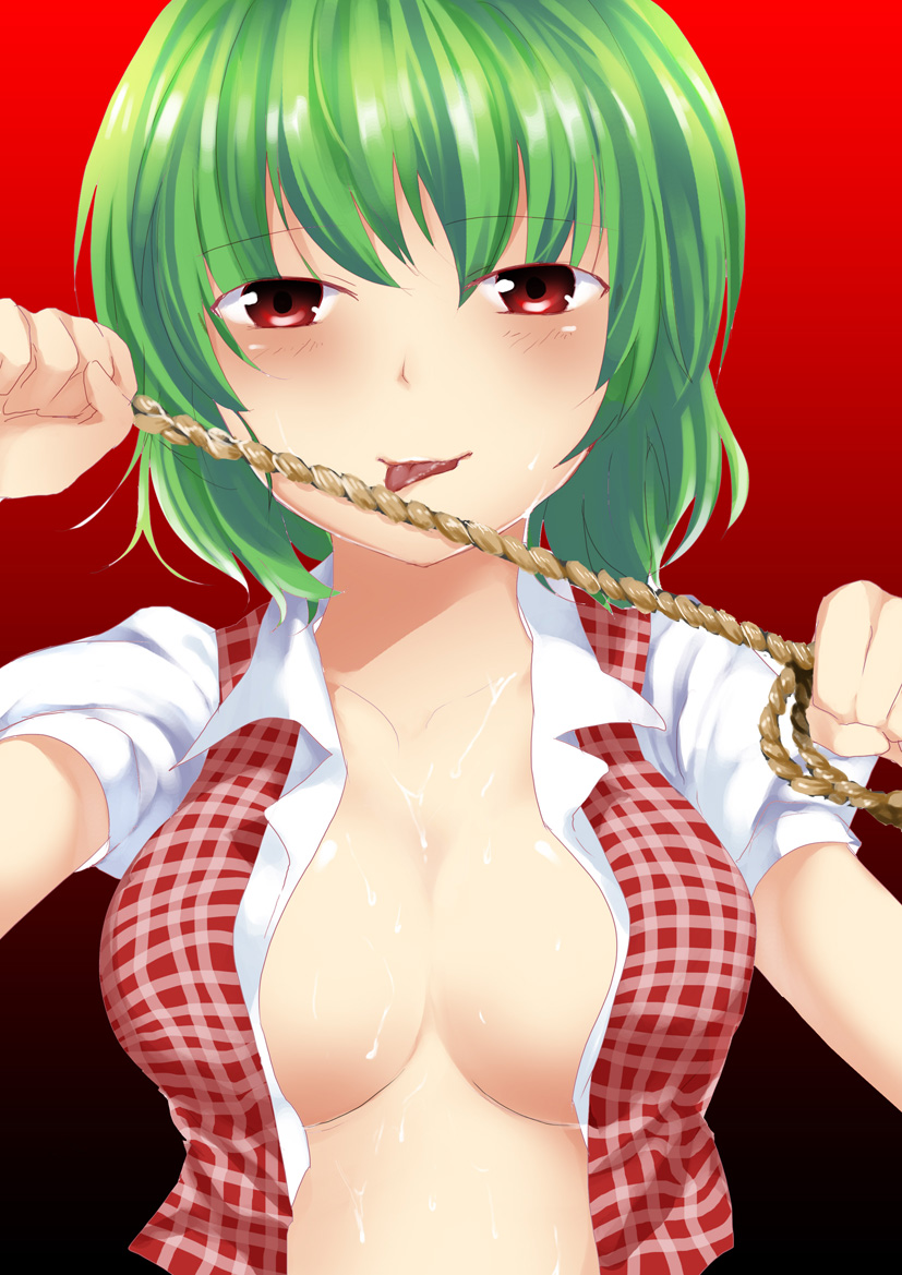 :p1girlbreastscleavagefemale focusgreen hairlarge breastslickingno braopen clothesopen shirtred eyesropeshiny skinshirtshort hairsolotonguetongue out