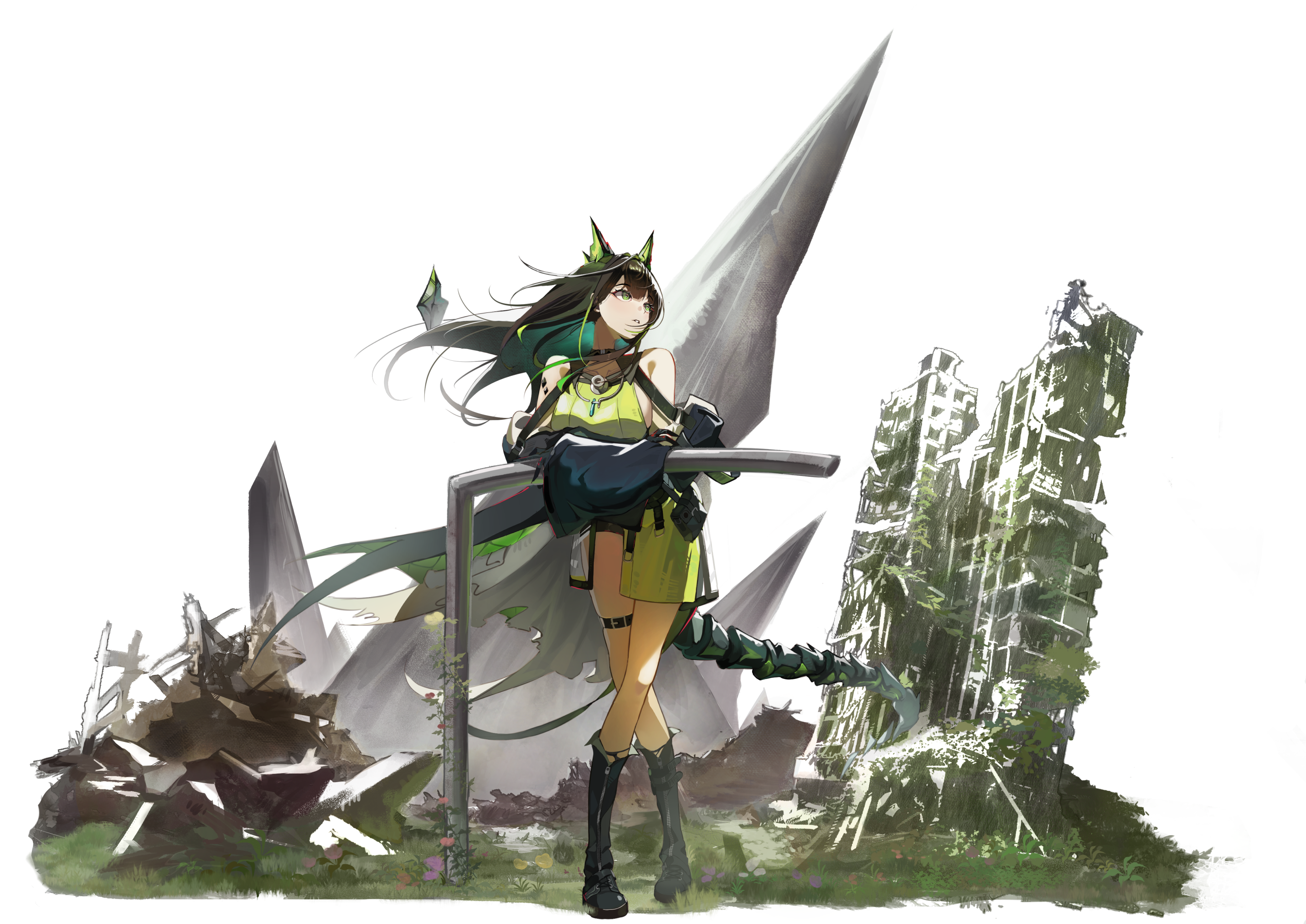 1girlbare shouldersblack bootsblack hairblack skinbootsbreastsbuildingcollarbonecolored inner haircolored skincrossed legsdressenergy tailfull bodygrassgreen dressgreen eyesgreen hairhair between eyesknee bootslegslooking to the sidematerial growthmulticolored hairoripathy lesion (arknights)parted lipssideboobsignwolfstandingstethoscope around neckthigh straptwo-tone hair