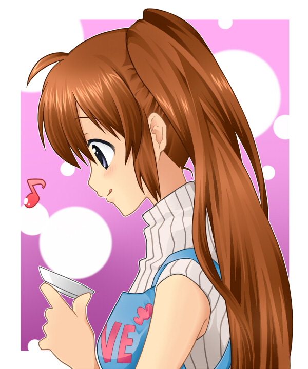 00s1girlapronblushbowlcovered navelfemale focusfrom sideholdinglooking backmusical noteprofileside ponytailsmilesolosweater vest