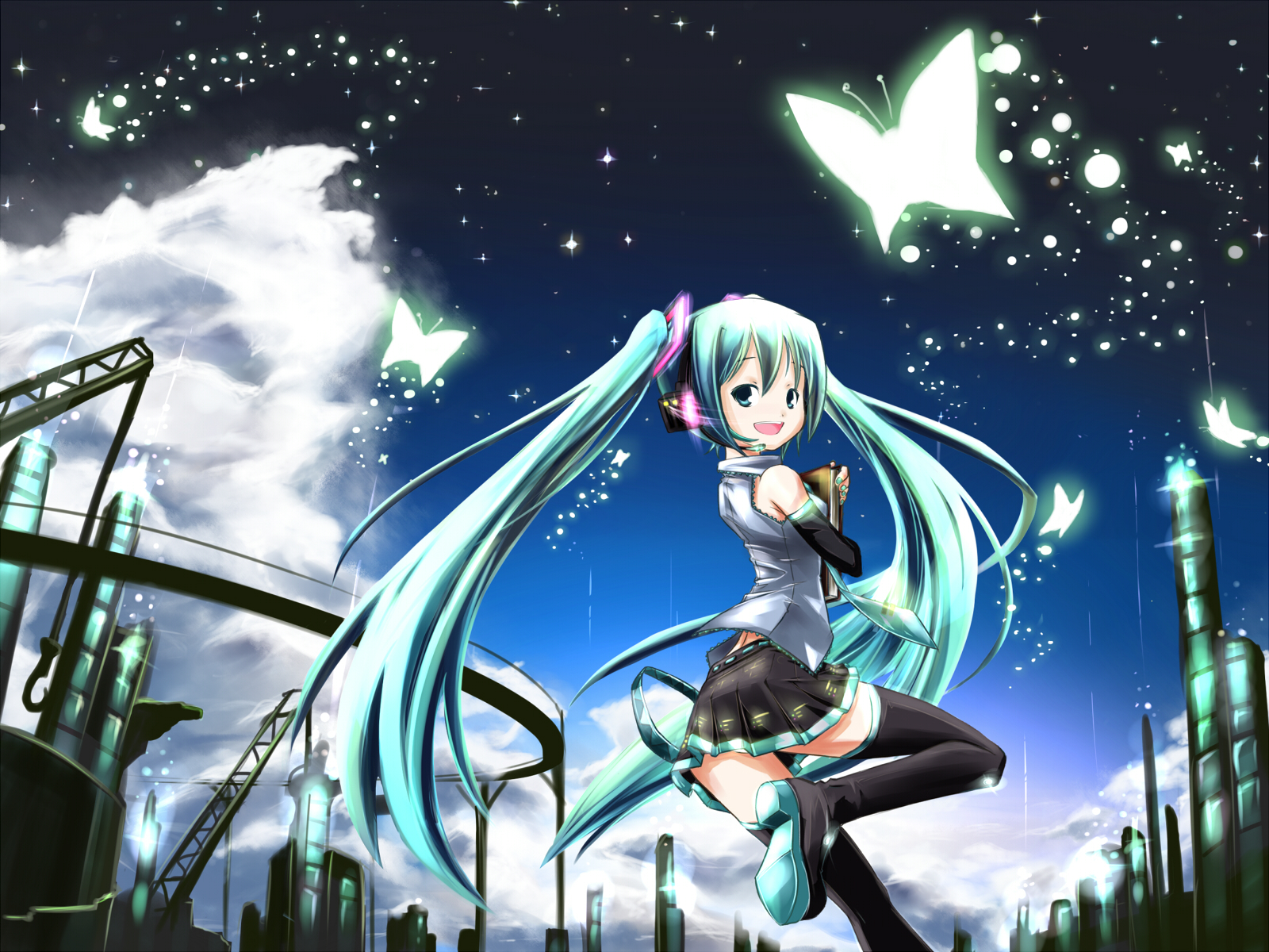 1girlaqua eyesaqua hairbookcityscapedetached sleevesfemale focusheadphonesheadsetlong hairlooking backnecktieskirtskysmilesolothighhighstwintailszettai ryouiki
